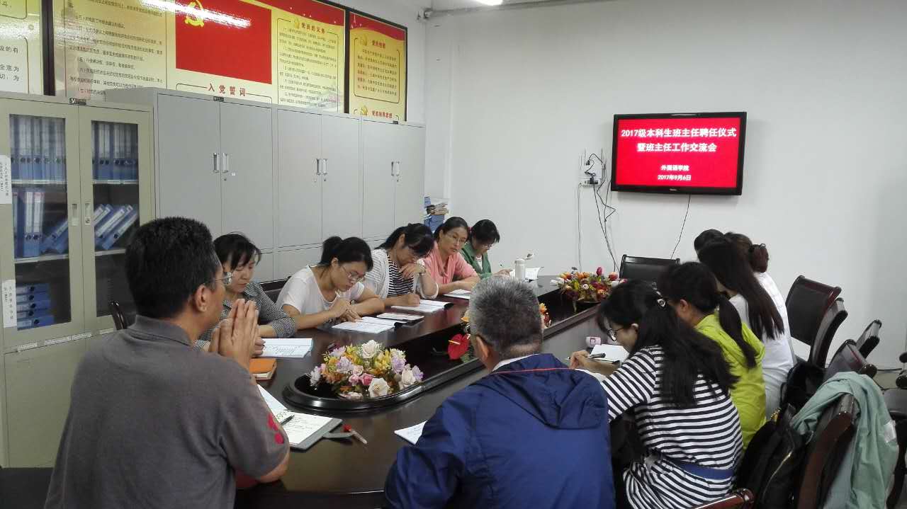 9月6日,冰球突破mg正规官网举行2017级本科班主任聘任仪式暨班主任工作交流会,院党委书记李双立、党委副书记马海超,2016级本科生班主任代表李庆建,2017级本科生班主任吴桂金等10名老师,新生辅导员王梦媛、杨洪敏等参加了会议。