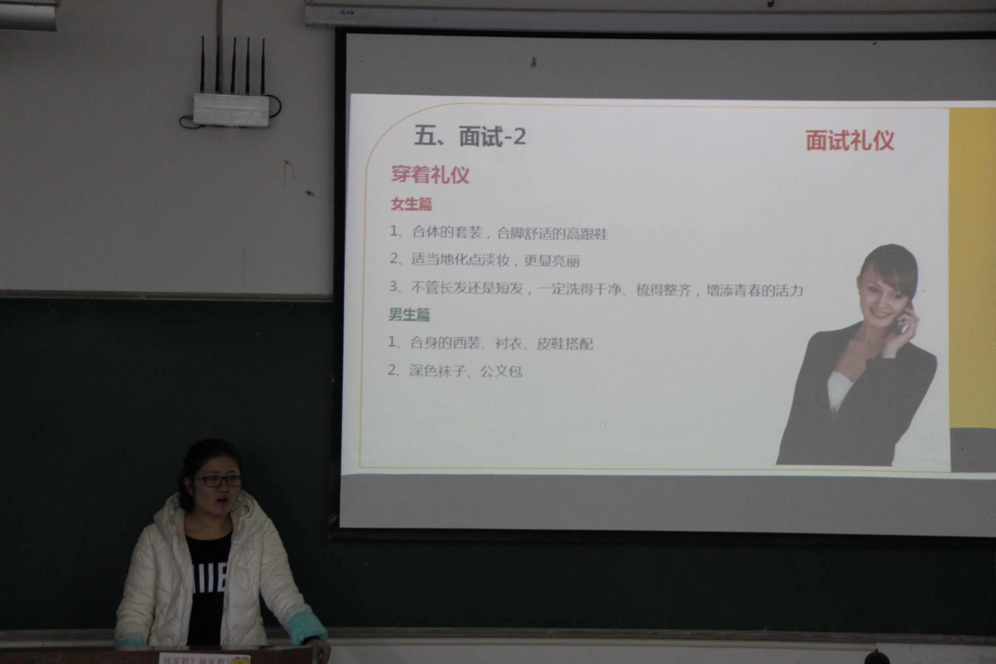 王蒙蒙学姐从求职现状、职业规划、求职渠道、简历制作、面试、工作签约六方面给同学们进行了全方位的讲解。王蒙蒙学姐将其在工作和面试过程中积累总结的经验和智慧毫无保留的分享给了同学们,给同学们展示了自己的简历并提供了制作简历的技巧与方法。语言浅显易懂,给同学们尤其是今年要找工作的毕业生上了一堂轻松愉快却又引人深思的课。此次讲座内容丰富,案例生动,分析透彻,语言风趣,贴合实际,具有很强的现实针对性,为同学们求职过程中遇到的问题提供了参考。(通讯员:郭星岑 吴迪)